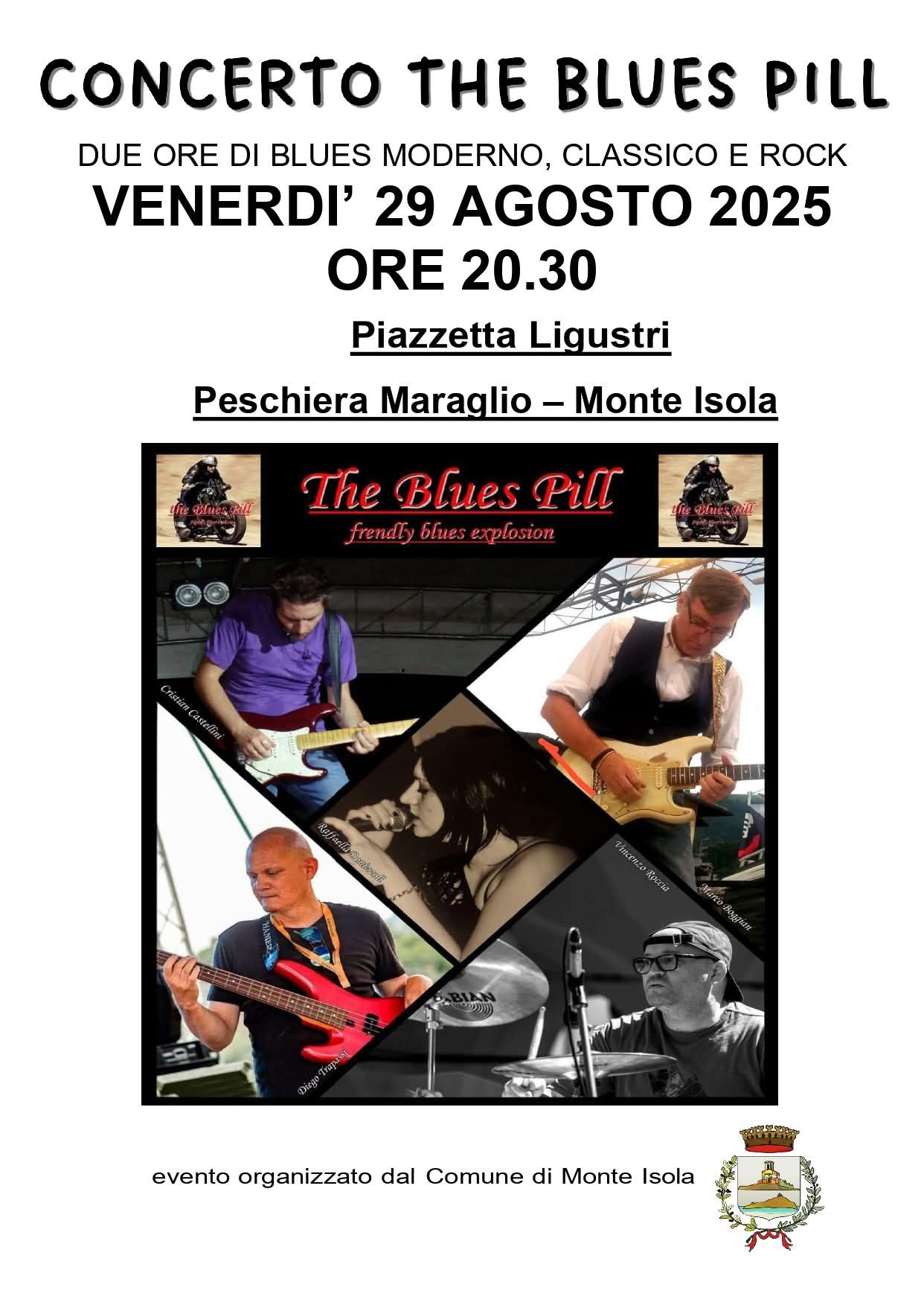 Venerdì 29 agosto alle 20.30, in Piazza Ligustri a Peschiera Maraglio si terrà il concerto ‘The Blues Pill’, con due ore di Blues moderno, classico e rock!