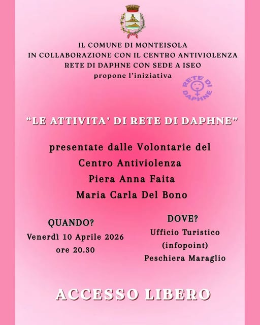 Venerdì 10 aprile alle ore 20.30, presso l’Infopoint di Monte Isola, si terrà l’incontro di presentazione delle attività dell’associazione antiviolenza ‘La Rete di Daphne‘. Terranno l’incontro le volontarie Piera Anna Faita e Maria Carla del Bono.